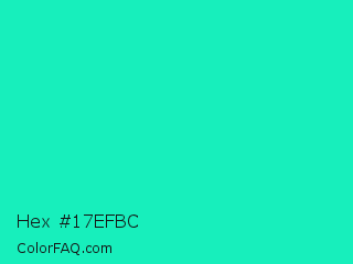 Hex #17efbc Color is a normal cyan color and the nearest color is Bright Turquoise #08e8de. Hex code #17efbc and RGB value is rgb(23,239,188). In RGB color space, this color is composed of 9% red, 94% green, 74% blue, In CMYK color space, this color is composed of 90% cyan, 0% magenta, 21% yellow , 6% black , In HSL color space, this color has a hue angle of 166° , 87% saturation and 51% lightness.