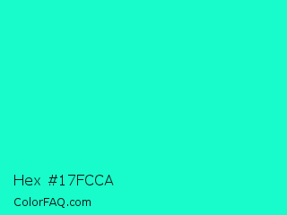 Hex #17fcca Color is a normal cyan color and the nearest color is Bright Turquoise #08e8de. Hex code #17fcca and RGB value is rgb(23,252,202). In RGB color space, this color is composed of 9% red, 99% green, 79% blue, In CMYK color space, this color is composed of 91% cyan, 0% magenta, 20% yellow , 1% black , In HSL color space, this color has a hue angle of 167° , 97% saturation and 54% lightness.