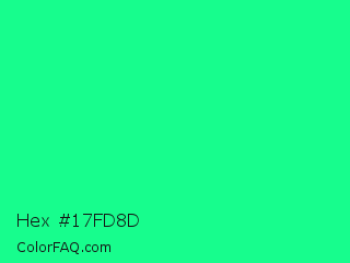 Hex #17fd8d Color is a normal green color and the nearest color is Medium Spring Green #00fa9a. Hex code #17fd8d and RGB value is rgb(23,253,141). In RGB color space, this color is composed of 9% red, 99% green, 55% blue, In CMYK color space, this color is composed of 91% cyan, 0% magenta, 44% yellow , 1% black , In HSL color space, this color has a hue angle of 151° , 98% saturation and 54% lightness.