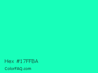 Hex #17ffba Color is a normal green color and the nearest color is Medium Spring Green #00fa9a. Hex code #17ffba and RGB value is rgb(23,255,186). In RGB color space, this color is composed of 9% red, 100% green, 73% blue, In CMYK color space, this color is composed of 91% cyan, 0% magenta, 27% yellow , 0% black , In HSL color space, this color has a hue angle of 162° , 100% saturation and 55% lightness.