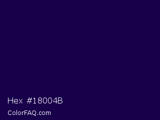 Hex #18004b Color is a very dark indigo color and the nearest color is Tolopea #1b0245. Hex code #18004b and RGB value is rgb(24,0,75). In RGB color space, this color is composed of 9% red, 0% green, 29% blue, In CMYK color space, this color is composed of 68% cyan, 100% magenta, 0% yellow , 71% black , In HSL color space, this color has a hue angle of 259° , 100% saturation and 15% lightness.