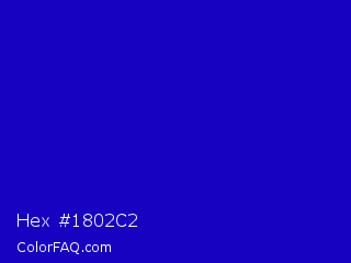 Hex #1802c2 Color is a normal indigo color and the nearest color is Dark Blue #0000c8. Hex code #1802c2 and RGB value is rgb(24,2,194). In RGB color space, this color is composed of 9% red, 1% green, 76% blue, In CMYK color space, this color is composed of 88% cyan, 99% magenta, 0% yellow , 24% black , In HSL color space, this color has a hue angle of 247° , 98% saturation and 38% lightness.