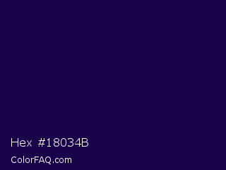 Hex #18034b Color is a very dark indigo color and the nearest color is Tolopea #1b0245. Hex code #18034b and RGB value is rgb(24,3,75). In RGB color space, this color is composed of 9% red, 1% green, 29% blue, In CMYK color space, this color is composed of 68% cyan, 96% magenta, 0% yellow , 71% black , In HSL color space, this color has a hue angle of 258° , 92% saturation and 15% lightness.