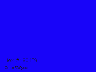 Hex #1804f9 Color is a normal indigo color and the nearest color is Blue #0000ff. Hex code #1804f9 and RGB value is rgb(24,4,249). In RGB color space, this color is composed of 9% red, 2% green, 98% blue, In CMYK color space, this color is composed of 90% cyan, 98% magenta, 0% yellow , 2% black , In HSL color space, this color has a hue angle of 245° , 97% saturation and 50% lightness.