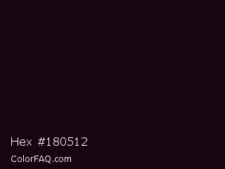 Hex #180512 Color is a almost black magenta color and the nearest color is Licorice #1a1110. Hex code #180512 and RGB value is rgb(24,5,18). In RGB color space, this color is composed of 9% red, 2% green, 7% blue, In CMYK color space, this color is composed of 0% cyan, 79% magenta, 25% yellow , 91% black , In HSL color space, this color has a hue angle of 319° , 66% saturation and 6% lightness.