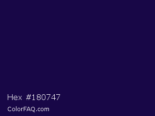 Hex #180747 Color is a very dark indigo color and the nearest color is Tolopea #1b0245. Hex code #180747 and RGB value is rgb(24,7,71). In RGB color space, this color is composed of 9% red, 3% green, 28% blue, In CMYK color space, this color is composed of 66% cyan, 90% magenta, 0% yellow , 72% black , In HSL color space, this color has a hue angle of 256° , 82% saturation and 15% lightness.