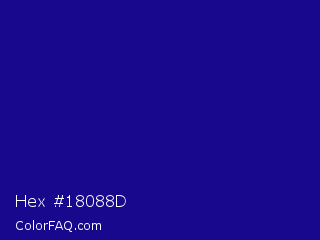 Hex #18088d Color is a dark indigo color and the nearest color is Ultramarine #120a8f. Hex code #18088d and RGB value is rgb(24,8,141). In RGB color space, this color is composed of 9% red, 3% green, 55% blue, In CMYK color space, this color is composed of 83% cyan, 94% magenta, 0% yellow , 45% black , In HSL color space, this color has a hue angle of 247° , 89% saturation and 29% lightness.