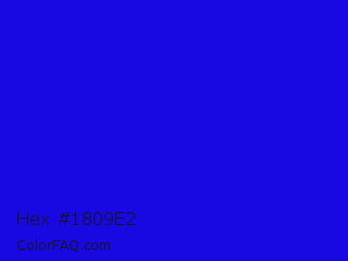 Hex #1809e2 Color is a normal indigo color and the nearest color is Bluebonnet #1c1cf0. Hex code #1809e2 and RGB value is rgb(24,9,226). In RGB color space, this color is composed of 9% red, 4% green, 89% blue, In CMYK color space, this color is composed of 89% cyan, 96% magenta, 0% yellow , 11% black , In HSL color space, this color has a hue angle of 244° , 92% saturation and 46% lightness.