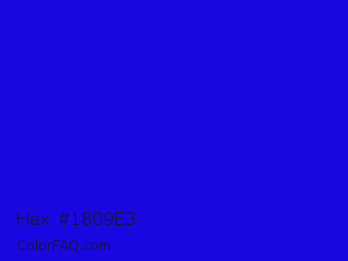 Hex #1809e3 Color is a normal indigo color and the nearest color is Bluebonnet #1c1cf0. Hex code #1809e3 and RGB value is rgb(24,9,227). In RGB color space, this color is composed of 9% red, 4% green, 89% blue, In CMYK color space, this color is composed of 89% cyan, 96% magenta, 0% yellow , 11% black , In HSL color space, this color has a hue angle of 244° , 92% saturation and 46% lightness.