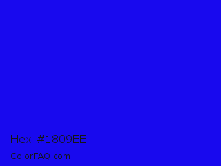 Hex #1809ee Color is a normal indigo color and the nearest color is Bluebonnet #1c1cf0. Hex code #1809ee and RGB value is rgb(24,9,238). In RGB color space, this color is composed of 9% red, 4% green, 93% blue, In CMYK color space, this color is composed of 90% cyan, 96% magenta, 0% yellow , 7% black , In HSL color space, this color has a hue angle of 244° , 93% saturation and 48% lightness.