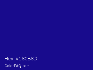 Hex #180b8d Color is a dark indigo color and the nearest color is Ultramarine #120a8f. Hex code #180b8d and RGB value is rgb(24,11,141). In RGB color space, this color is composed of 9% red, 4% green, 55% blue, In CMYK color space, this color is composed of 83% cyan, 92% magenta, 0% yellow , 45% black , In HSL color space, this color has a hue angle of 246° , 86% saturation and 30% lightness.