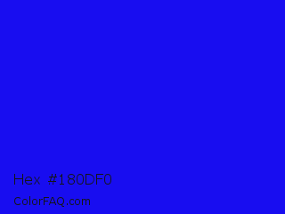 Hex #180df0 Color is a normal indigo color and the nearest color is Bluebonnet #1c1cf0. Hex code #180df0 and RGB value is rgb(24,13,240). In RGB color space, this color is composed of 9% red, 5% green, 94% blue, In CMYK color space, this color is composed of 90% cyan, 95% magenta, 0% yellow , 6% black , In HSL color space, this color has a hue angle of 243° , 90% saturation and 50% lightness.