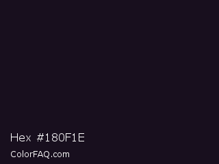 Hex #180f1e Color is a almost black purple color and the nearest color is Vulcan #10121d. Hex code #180f1e and RGB value is rgb(24,15,30). In RGB color space, this color is composed of 9% red, 6% green, 12% blue, In CMYK color space, this color is composed of 20% cyan, 50% magenta, 0% yellow , 88% black , In HSL color space, this color has a hue angle of 276° , 33% saturation and 9% lightness.