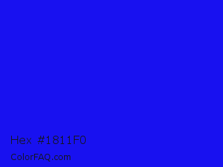 Hex #1811f0 Color is a normal indigo color and the nearest color is Bluebonnet #1c1cf0. Hex code #1811f0 and RGB value is rgb(24,17,240). In RGB color space, this color is composed of 9% red, 7% green, 94% blue, In CMYK color space, this color is composed of 90% cyan, 93% magenta, 0% yellow , 6% black , In HSL color space, this color has a hue angle of 242° , 88% saturation and 50% lightness.