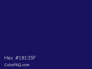Hex #18135f Color is a very dark indigo color and the nearest color is Lucky Point #1a1a68. Hex code #18135f and RGB value is rgb(24,19,95). In RGB color space, this color is composed of 9% red, 7% green, 37% blue, In CMYK color space, this color is composed of 75% cyan, 80% magenta, 0% yellow , 63% black , In HSL color space, this color has a hue angle of 244° , 67% saturation and 22% lightness.