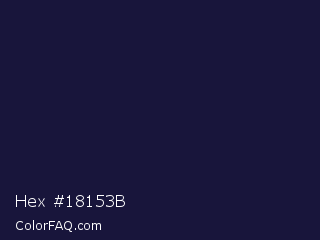 Hex #18153b Color is a very dark indigo color and the nearest color is Haiti #1b1035. Hex code #18153b and RGB value is rgb(24,21,59). In RGB color space, this color is composed of 9% red, 8% green, 23% blue, In CMYK color space, this color is composed of 59% cyan, 64% magenta, 0% yellow , 77% black , In HSL color space, this color has a hue angle of 245° , 48% saturation and 16% lightness.
