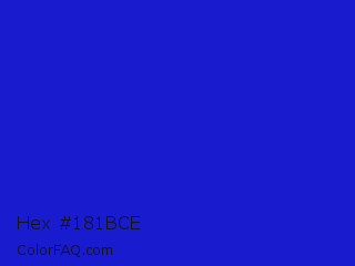 Hex #181bce Color is a normal blue color and the nearest color is Interdimensional Blue #360ccc. Hex code #181bce and RGB value is rgb(24,27,206). In RGB color space, this color is composed of 9% red, 11% green, 81% blue, In CMYK color space, this color is composed of 88% cyan, 87% magenta, 0% yellow , 19% black , In HSL color space, this color has a hue angle of 239° , 79% saturation and 45% lightness.