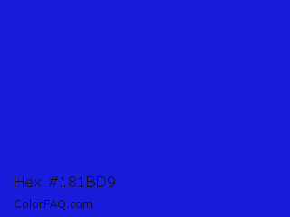 Hex #181bd9 Color is a normal blue color and the nearest color is Bluebonnet #1c1cf0. Hex code #181bd9 and RGB value is rgb(24,27,217). In RGB color space, this color is composed of 9% red, 11% green, 85% blue, In CMYK color space, this color is composed of 89% cyan, 88% magenta, 0% yellow , 15% black , In HSL color space, this color has a hue angle of 239° , 80% saturation and 47% lightness.