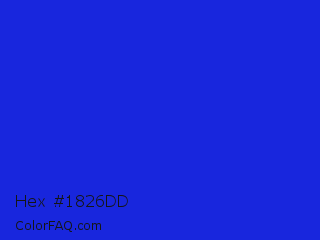 Hex #1826dd Color is a normal blue color and the nearest color is Bluebonnet #1c1cf0. Hex code #1826dd and RGB value is rgb(24,38,221). In RGB color space, this color is composed of 9% red, 15% green, 87% blue, In CMYK color space, this color is composed of 89% cyan, 83% magenta, 0% yellow , 13% black , In HSL color space, this color has a hue angle of 236° , 80% saturation and 48% lightness.