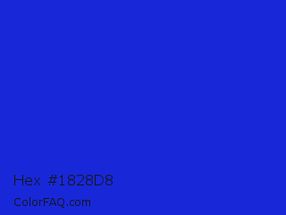 Hex #1828d8 Color is a normal blue color and the nearest color is Palatinate Blue #273be2. Hex code #1828d8 and RGB value is rgb(24,40,216). In RGB color space, this color is composed of 9% red, 16% green, 85% blue, In CMYK color space, this color is composed of 89% cyan, 81% magenta, 0% yellow , 15% black , In HSL color space, this color has a hue angle of 235° , 80% saturation and 47% lightness.
