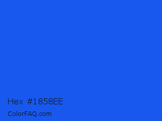 Hex #1858ee Color is a normal blue color and the nearest color is Blue RYB #0247fe. Hex code #1858ee and RGB value is rgb(24,88,238). In RGB color space, this color is composed of 9% red, 35% green, 93% blue, In CMYK color space, this color is composed of 90% cyan, 63% magenta, 0% yellow , 7% black , In HSL color space, this color has a hue angle of 222° , 86% saturation and 51% lightness.