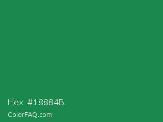 Hex #18884b Color is a normal green color and the nearest color is Salem #097f4b. Hex code #18884b and RGB value is rgb(24,136,75). In RGB color space, this color is composed of 9% red, 53% green, 29% blue, In CMYK color space, this color is composed of 82% cyan, 0% magenta, 45% yellow , 47% black , In HSL color space, this color has a hue angle of 147° , 70% saturation and 31% lightness.