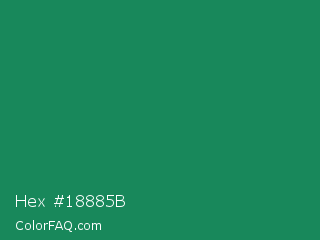 Hex #18885b Color is a normal green color and the nearest color is Eucalyptus #278a5b. Hex code #18885b and RGB value is rgb(24,136,91). In RGB color space, this color is composed of 9% red, 53% green, 36% blue, In CMYK color space, this color is composed of 82% cyan, 0% magenta, 33% yellow , 47% black , In HSL color space, this color has a hue angle of 156° , 70% saturation and 31% lightness.