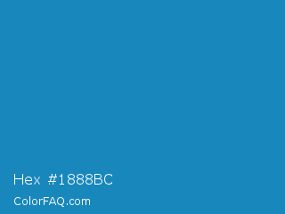 Hex #1888bc Color is a normal blue color and the nearest color is Cyan Cornflower Blue #188bc2. Hex code #1888bc and RGB value is rgb(24,136,188). In RGB color space, this color is composed of 9% red, 53% green, 74% blue, In CMYK color space, this color is composed of 87% cyan, 28% magenta, 0% yellow , 26% black , In HSL color space, this color has a hue angle of 199° , 77% saturation and 42% lightness.