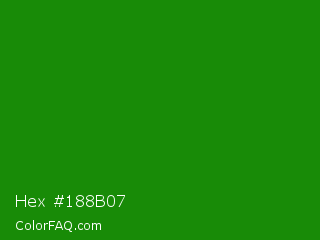 Hex #188b07 Color is a dark green color and the nearest color is India Green #138808. Hex code #188b07 and RGB value is rgb(24,139,7). In RGB color space, this color is composed of 9% red, 55% green, 3% blue, In CMYK color space, this color is composed of 83% cyan, 0% magenta, 95% yellow , 45% black , In HSL color space, this color has a hue angle of 112° , 90% saturation and 29% lightness.