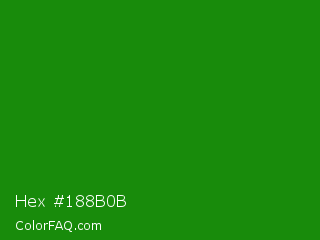 Hex #188b0b Color is a dark green color and the nearest color is India Green #138808. Hex code #188b0b and RGB value is rgb(24,139,11). In RGB color space, this color is composed of 9% red, 55% green, 4% blue, In CMYK color space, this color is composed of 83% cyan, 0% magenta, 92% yellow , 45% black , In HSL color space, this color has a hue angle of 114° , 85% saturation and 29% lightness.