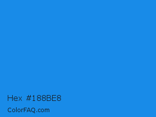Hex #188be8 Color is a normal blue color and the nearest color is Dodger Blue #1e90ff. Hex code #188be8 and RGB value is rgb(24,139,232). In RGB color space, this color is composed of 9% red, 55% green, 91% blue, In CMYK color space, this color is composed of 90% cyan, 40% magenta, 0% yellow , 9% black , In HSL color space, this color has a hue angle of 207° , 82% saturation and 50% lightness.