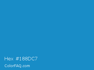 Hex #188dc7 Color is a normal blue color and the nearest color is Cyan Cornflower Blue #188bc2. Hex code #188dc7 and RGB value is rgb(24,141,199). In RGB color space, this color is composed of 9% red, 55% green, 78% blue, In CMYK color space, this color is composed of 88% cyan, 29% magenta, 0% yellow , 22% black , In HSL color space, this color has a hue angle of 200° , 78% saturation and 44% lightness.