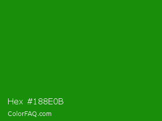 Hex #188e0b Color is a dark green color and the nearest color is India Green #138808. Hex code #188e0b and RGB value is rgb(24,142,11). In RGB color space, this color is composed of 9% red, 56% green, 4% blue, In CMYK color space, this color is composed of 83% cyan, 0% magenta, 92% yellow , 44% black , In HSL color space, this color has a hue angle of 114° , 86% saturation and 30% lightness.