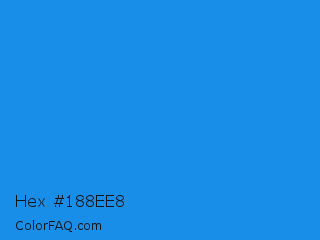 Hex #188ee8 Color is a normal blue color and the nearest color is Button Blue #24a0ed. Hex code #188ee8 and RGB value is rgb(24,142,232). In RGB color space, this color is composed of 9% red, 56% green, 91% blue, In CMYK color space, this color is composed of 90% cyan, 39% magenta, 0% yellow , 9% black , In HSL color space, this color has a hue angle of 206° , 82% saturation and 50% lightness.