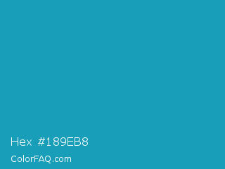 Hex #189eb8 Color is a normal cyan color and the nearest color is Eastern Blue #1e9ab0. Hex code #189eb8 and RGB value is rgb(24,158,184). In RGB color space, this color is composed of 9% red, 62% green, 72% blue, In CMYK color space, this color is composed of 87% cyan, 14% magenta, 0% yellow , 28% black , In HSL color space, this color has a hue angle of 190° , 77% saturation and 41% lightness.