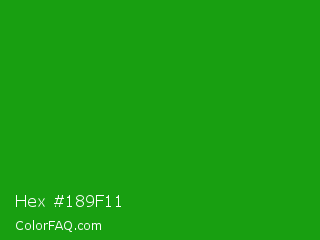 Hex #189f11 Color is a normal green color and the nearest color is Slimy Green #299617. Hex code #189f11 and RGB value is rgb(24,159,17). In RGB color space, this color is composed of 9% red, 62% green, 7% blue, In CMYK color space, this color is composed of 85% cyan, 0% magenta, 89% yellow , 38% black , In HSL color space, this color has a hue angle of 117° , 81% saturation and 35% lightness.