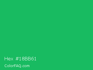 Hex #18bb61 Color is a normal green color and the nearest color is Green Crayola #1cac78. Hex code #18bb61 and RGB value is rgb(24,187,97). In RGB color space, this color is composed of 9% red, 73% green, 38% blue, In CMYK color space, this color is composed of 87% cyan, 0% magenta, 48% yellow , 27% black , In HSL color space, this color has a hue angle of 147° , 77% saturation and 41% lightness.