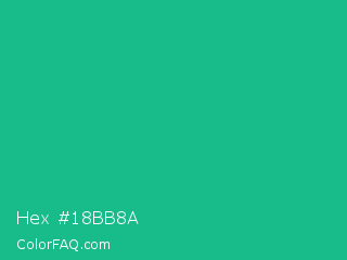 Hex #18bb8a Color is a normal green color and the nearest color is Mountain Meadow Crayola #1ab385. Hex code #18bb8a and RGB value is rgb(24,187,138). In RGB color space, this color is composed of 9% red, 73% green, 54% blue, In CMYK color space, this color is composed of 87% cyan, 0% magenta, 26% yellow , 27% black , In HSL color space, this color has a hue angle of 162° , 77% saturation and 41% lightness.