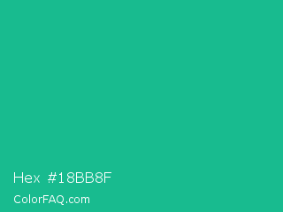 Hex #18bb8f Color is a normal cyan color and the nearest color is Mountain Meadow Crayola #1ab385. Hex code #18bb8f and RGB value is rgb(24,187,143). In RGB color space, this color is composed of 9% red, 73% green, 56% blue, In CMYK color space, this color is composed of 87% cyan, 0% magenta, 24% yellow , 27% black , In HSL color space, this color has a hue angle of 164° , 77% saturation and 41% lightness.