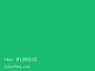 Hex #18be6e Color is a normal green color and the nearest color is Green Crayola #1cac78. Hex code #18be6e and RGB value is rgb(24,190,110). In RGB color space, this color is composed of 9% red, 75% green, 43% blue, In CMYK color space, this color is composed of 87% cyan, 0% magenta, 42% yellow , 25% black , In HSL color space, this color has a hue angle of 151° , 78% saturation and 42% lightness.