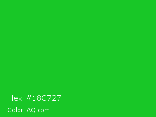 Hex #18c727 Color is a normal green color and the nearest color is Vivid Malachite #00cc33. Hex code #18c727 and RGB value is rgb(24,199,39). In RGB color space, this color is composed of 9% red, 78% green, 15% blue, In CMYK color space, this color is composed of 88% cyan, 0% magenta, 80% yellow , 22% black , In HSL color space, this color has a hue angle of 125° , 78% saturation and 44% lightness.