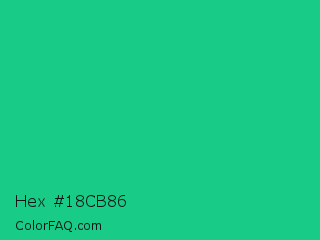 Hex #18cb86 Color is a normal green color and the nearest color is Mountain Meadow Crayola #1ab385. Hex code #18cb86 and RGB value is rgb(24,203,134). In RGB color space, this color is composed of 9% red, 80% green, 53% blue, In CMYK color space, this color is composed of 88% cyan, 0% magenta, 34% yellow , 20% black , In HSL color space, this color has a hue angle of 157° , 79% saturation and 45% lightness.