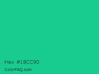 Hex #18cc90 Color is a normal green color and the nearest color is Caribbean Green #00cc99. Hex code #18cc90 and RGB value is rgb(24,204,144). In RGB color space, this color is composed of 9% red, 80% green, 56% blue, In CMYK color space, this color is composed of 88% cyan, 0% magenta, 29% yellow , 20% black , In HSL color space, this color has a hue angle of 160° , 79% saturation and 45% lightness.