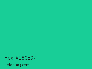 Hex #18ce97 Color is a normal green color and the nearest color is Caribbean Green #00cc99. Hex code #18ce97 and RGB value is rgb(24,206,151). In RGB color space, this color is composed of 9% red, 81% green, 59% blue, In CMYK color space, this color is composed of 88% cyan, 0% magenta, 27% yellow , 19% black , In HSL color space, this color has a hue angle of 162° , 79% saturation and 45% lightness.