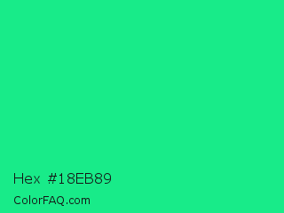 Hex #18eb89 Color is a normal green color and the nearest color is Spring Green #00ff7f. Hex code #18eb89 and RGB value is rgb(24,235,137). In RGB color space, this color is composed of 9% red, 92% green, 54% blue, In CMYK color space, this color is composed of 90% cyan, 0% magenta, 42% yellow , 8% black , In HSL color space, this color has a hue angle of 152° , 84% saturation and 51% lightness.