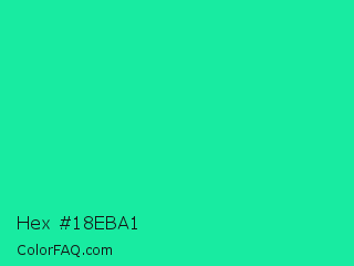 Hex #18eba1 Color is a normal green color and the nearest color is Medium Spring Green #00fa9a. Hex code #18eba1 and RGB value is rgb(24,235,161). In RGB color space, this color is composed of 9% red, 92% green, 63% blue, In CMYK color space, this color is composed of 90% cyan, 0% magenta, 31% yellow , 8% black , In HSL color space, this color has a hue angle of 159° , 84% saturation and 51% lightness.