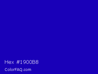Hex #1900b8 Color is a normal indigo color and the nearest color is Dark Blue #0000c8. Hex code #1900b8 and RGB value is rgb(25,0,184). In RGB color space, this color is composed of 10% red, 0% green, 72% blue, In CMYK color space, this color is composed of 86% cyan, 100% magenta, 0% yellow , 28% black , In HSL color space, this color has a hue angle of 248° , 100% saturation and 36% lightness.
