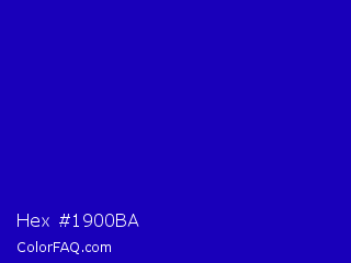 Hex #1900ba Color is a normal indigo color and the nearest color is Dark Blue #0000c8. Hex code #1900ba and RGB value is rgb(25,0,186). In RGB color space, this color is composed of 10% red, 0% green, 73% blue, In CMYK color space, this color is composed of 87% cyan, 100% magenta, 0% yellow , 27% black , In HSL color space, this color has a hue angle of 248° , 100% saturation and 36% lightness.