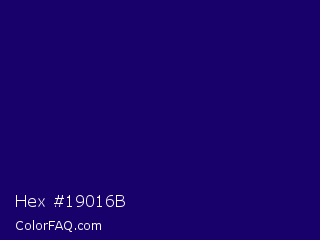 Hex #19016b Color is a very dark indigo color and the nearest color is Paua #260368. Hex code #19016b and RGB value is rgb(25,1,107). In RGB color space, this color is composed of 10% red, 0% green, 42% blue, In CMYK color space, this color is composed of 77% cyan, 99% magenta, 0% yellow , 58% black , In HSL color space, this color has a hue angle of 254° , 98% saturation and 21% lightness.
