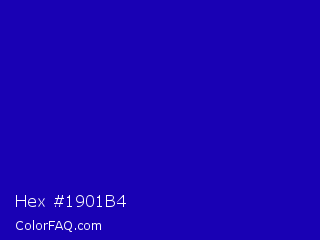 Hex #1901b4 Color is a normal indigo color and the nearest color is Dark Blue #0000c8. Hex code #1901b4 and RGB value is rgb(25,1,180). In RGB color space, this color is composed of 10% red, 0% green, 71% blue, In CMYK color space, this color is composed of 86% cyan, 99% magenta, 0% yellow , 29% black , In HSL color space, this color has a hue angle of 248° , 99% saturation and 35% lightness.
